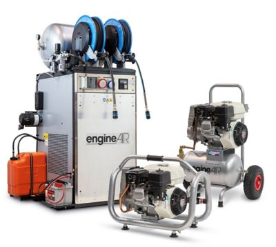Utilizar herramientas neumáticas que funcionan con un compresor de aire alimentado por gasolina o diésel es una opción segura, fiable y resistente. Muchos profesionales del sector instalan los compresores dentro de sus furgonetas o camionetas, pero dependiendo del tamaño del depósito de aire o la potencia del compresor, la instalación puede ser más difícil de lo esperado y en cualquier caso requerir una homologación para poder circular con el vehículo.