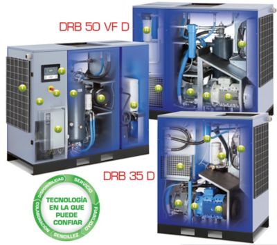 Cualquier aparato de nuestras series DRB y DRB VF de compresores de tornillo con inyección de aceite de alta calidad es una opción de la que no te arrepentirás.