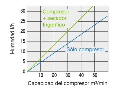 A quantidade de condensação é calculada a uma temperatura do ar de entrada no compressor de 20 °C, uma HR de 70% e uma pressão de trabalho de 8 bar.