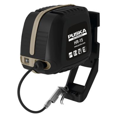 O novo PUSKA HR-15 é um compressor alojado num chassis robusto montado directamente na parede para poupar espaço. Dispõe de um rolo de mangueira de 10 m e é fornecido com uma pistola de ar, juntamente com os tacos e parafusos para fixação.